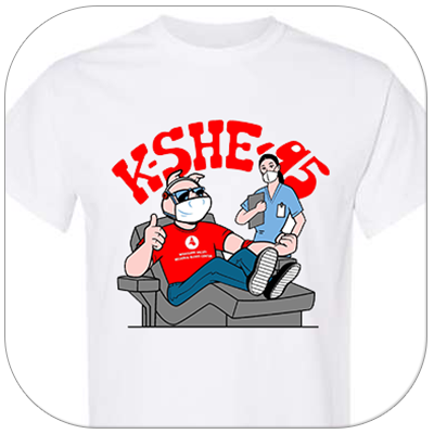Grab your Summer 2020 KSHE t-shirt today, with mascot “Sweetmeat” sporting a mask while safely donating blood. Design is printed on a 100% cotton white t-shirt. Limited quantities available.