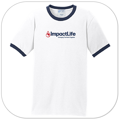 This retro-inspired ringer tee is classic. 100% cotton white t-shirt with navy trim, featuring navy and red ImpactLife logo. True to size, but size up if between sizes. Limited Sizes, will not be restocked