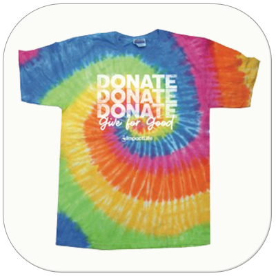 ImpactLife tie-dye 100% cotton t-shirt featuring a distressed white "Donate & Give for Good" design. Limited Quantities.