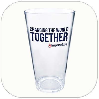 This clear GLASS pub-style tumbler holds 16 oz. of your favorite beverage. One of our most popular donor gifts. Navy and red design reads "Changing the World Together" and the ImpactLife name and logo.