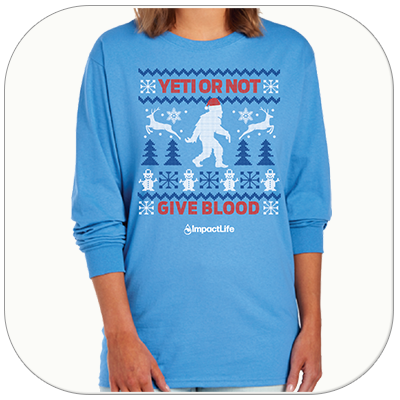 Limited edition. Light blue, long-sleeve t-shirt that reads "Yeti or Not, Give Blood" in a fun "ugly sweater" themed design. 100% preshrunk cotton. True to size. If between sizes, size up.