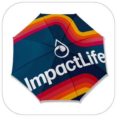 This ImpactLife travel umbrella folds up small (9.5”) so it’s always there when you need it. Features a 42” arc, rubber-coated handle, wrist strap, and storage sleeve. 100% polyester canopy (navy, red, orange, and yellow ImpactLife design); steel frame.