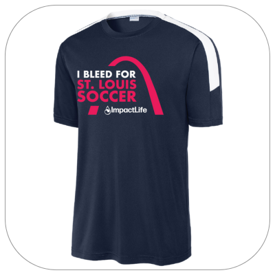 Put yourself at the top of the game with this athletic tee that reads “I Bleed St. Louis Soccer” on navy shirt with white accents on shoulders. Made from moisture-wicking polyester. Tear-away label.