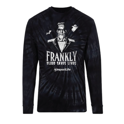 Long-sleeve black tone tie-dye tee with white distressed imprint, "Frankly Blood Saves Lives" design. As supply runs low, some shirts may be replaced with solid black. 100% Pre-shrunk cotton. 4X shirts are a blend of 50 cotton/50 poly. True to size; size up if between sizes.