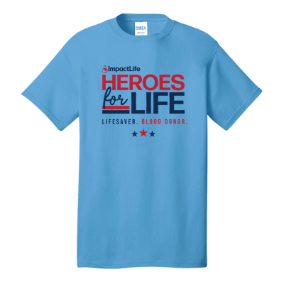 This "Heroes for Life" tee is in recognition to the first responders that support our mission. Shirt is light blue with red and darker blue graphics. 100% preshrunk cotton