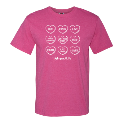 This heather pink festive tee is inspired by the popular candy treats. White imprint on heather pink tee. 50% Cotton, 50% Polyester Tee.