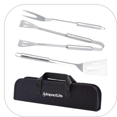 Take on summer with this 4 piece grilling kit for outdoor cooking. Includes spatula, grill fork, a pair of tongs, and a cloth storage bag. Stainless Steel Construction. Dishwasher safe. Spatula is 13.6" L x 3.15" W, Fork 13.8" L x 1.38" W, Tongs 13.8" L x 3.74" W.