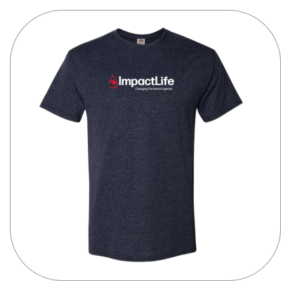 Heather Navy Tee with ImpactLife Logo across the chest. Pre-shrunk 50% cotton - 50% Polyester.