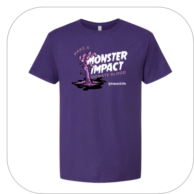 You've made a Monster Impact by donating blood for patients in need, now you can show it with this fun tee! Purple tee with in white and lighter purple. 100% Pre-shrunk Cotton. Sizes small through 4X. Will increase to 800 points on Nov 10.