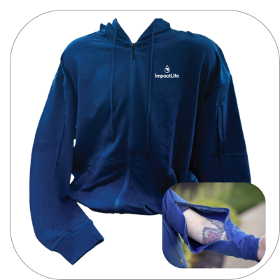 Navy full-zip hoodie with discreet zipper openings on both sleeves for easy access during blood donations or medical procedures. Made from a soft 95% cotton/5% spandex blend and finished with a clean white logo for comfort, flexibility, and everyday style.