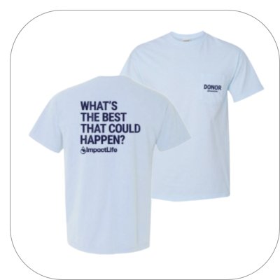 Comfort Colors Pocket T-shirt in light blue. Back features design saying "What's The Best That Could Happen?" Front features "Donor" on the pocket. Sizes small through 4X. 100% preshrunk cotton. Limited edition - will not be restocked